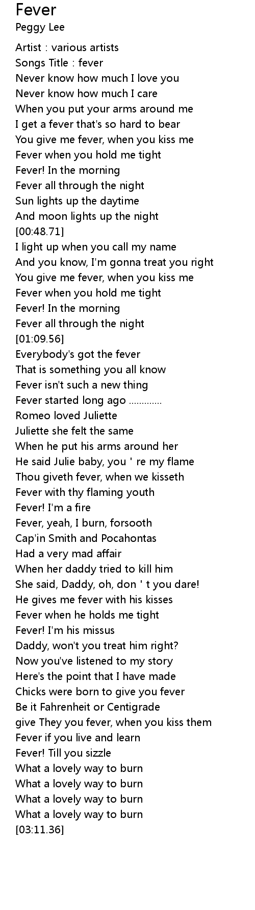 | [00:55.33] | You give me fever, when you kiss me |