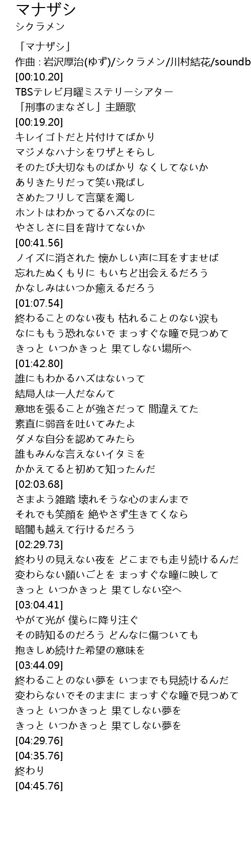 | [00:00.20] | 「マナザシ」 |