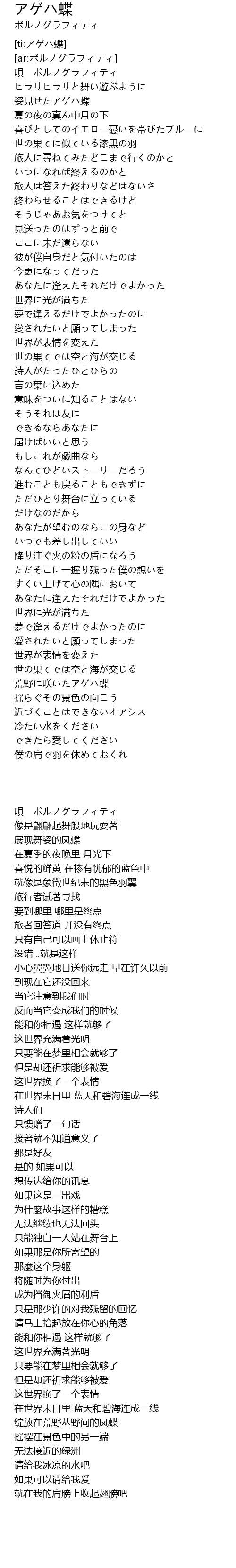 | [00:11.318] | 姿見せたアゲハ蝶 |