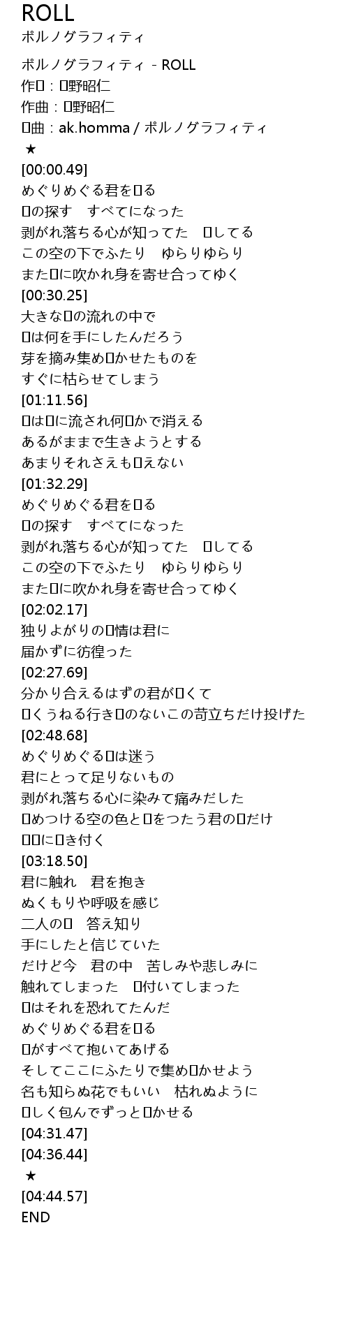 | [00:00.00] | ポルノグラフィティ - ROLL |