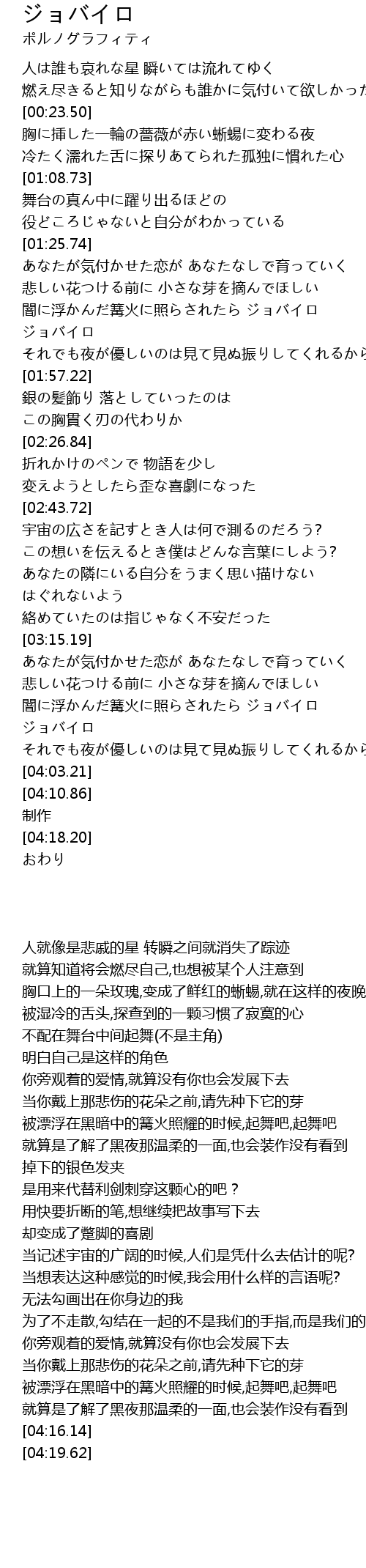 | [01:41.14] | 闇に浮かんだ篝火に照らされたら ジョバイロ ジョバイロ |