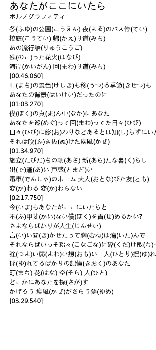 | [03:09.670] | 町(まち) 花(はな) 空(そら) 人(ひと) どこかにあなたを探(さが)す |