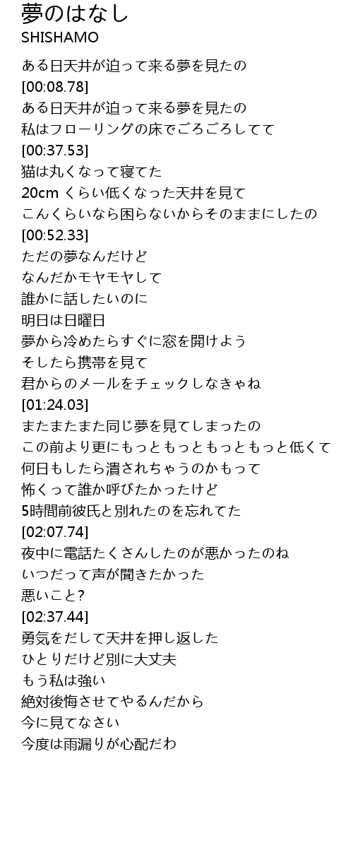 | [00:00.34] | ある日天井が迫って来る夢を見たの |