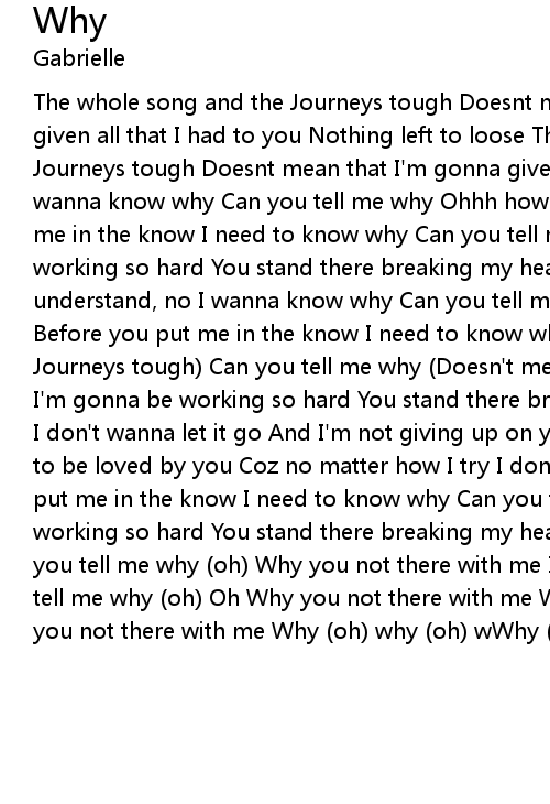 The whole song and the Journeys tough Doesnt mean that I'm gonna give up Ive given all that I had to you Nothing left to loose The whole song and the Journeys tough Doesnt mean that I'm gonna give up This is all I ask from you I wanna know why Can you tell me why Ohhh how far do I have to go Before you put me in the know I need to know why Can you tell me why Promise I'm gonna be working so hard You stand there breaking my heart Tell me how far I don't understand, no I wanna know why Can you tell me why Ohhh how far do I have to go Before you put me in the know I need to know why (The whole song and the Journeys tough) Can you tell me why (Doesn't mean that im gonna give up)Promise I'm gonna be working so hard You stand there breaking my heart Oh its been tough I don't wanna let it go And I'm not giving up on you (You should know) I wanted to be loved by you Coz no matter how I try I don't wanna let it go Before you put me in the know I need to know why Can you tell me why Promise I'm gonna be working so hard You stand there breaking my heart I need to know why (oh) Can you tell me why (oh) Why you not there with me I wanna know why (oh) Can you tell me why (oh) Oh Why you not there with me Why (oh) why (oh) why (oh) Oh why you not there with me Why (oh) why (oh) wWhy (oh) you not there with me |