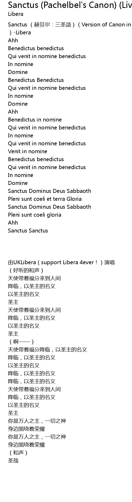 | [00:00.00] | Sanctus hè bèi ěr: sān shèng sòng Version of Canon in D Major Libera |
