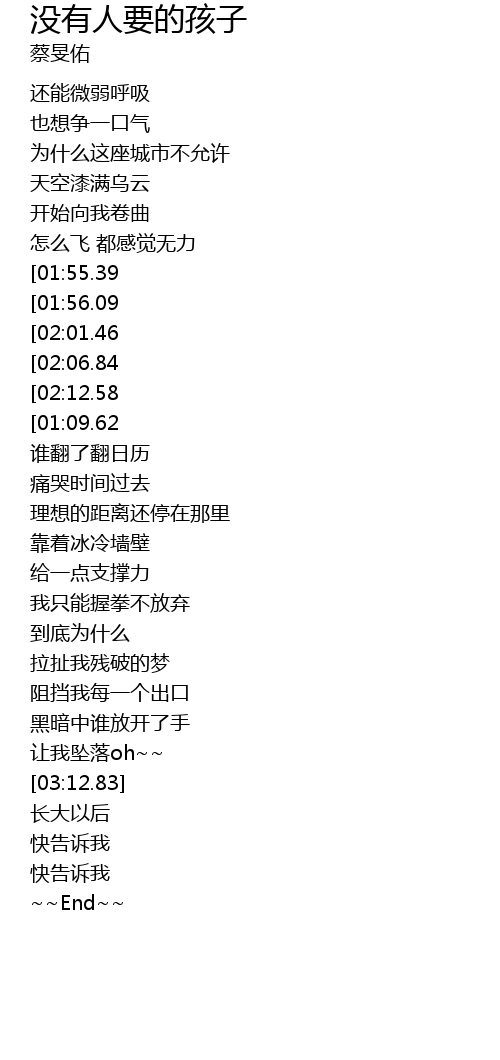 | [02:54.57][02:01.46][00:52.17] | 我是个没有人要的孩子 |