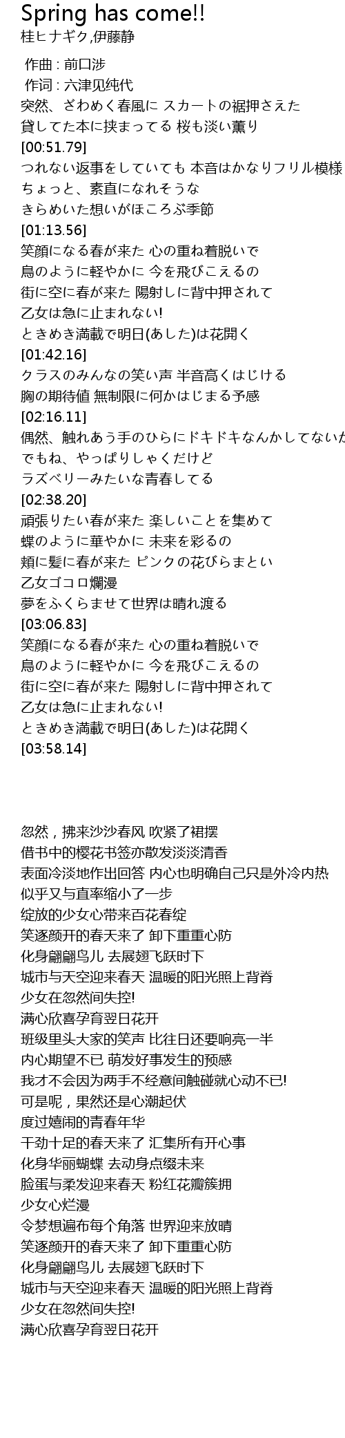 | [03:29.17] | 笑顔になる春が来た 心の重ね着脱いで |