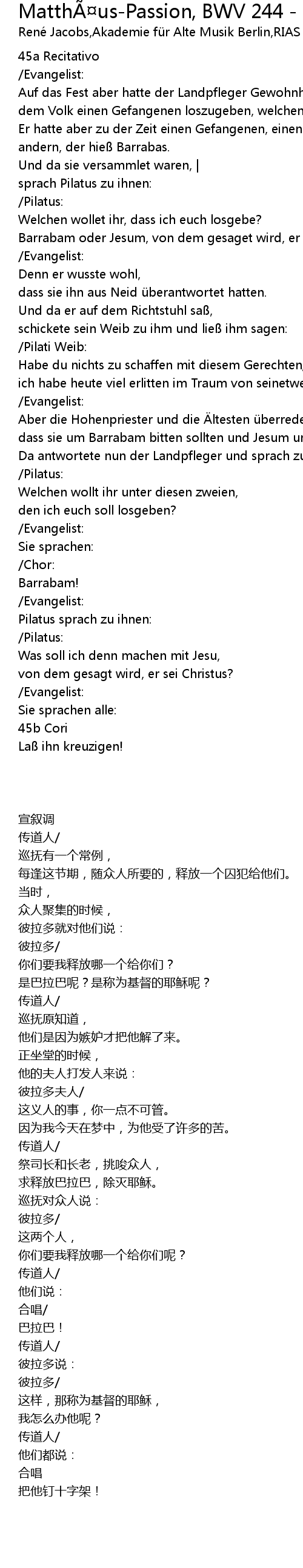 | [00:33.695] | Barrabam oder Jesum, von dem gesaget wird, er sei Christus? |