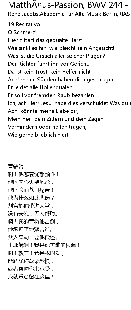 | [01:04.426] | Ich, ach Herr Jesu, habe dies verschuldet Was du erduldet. |