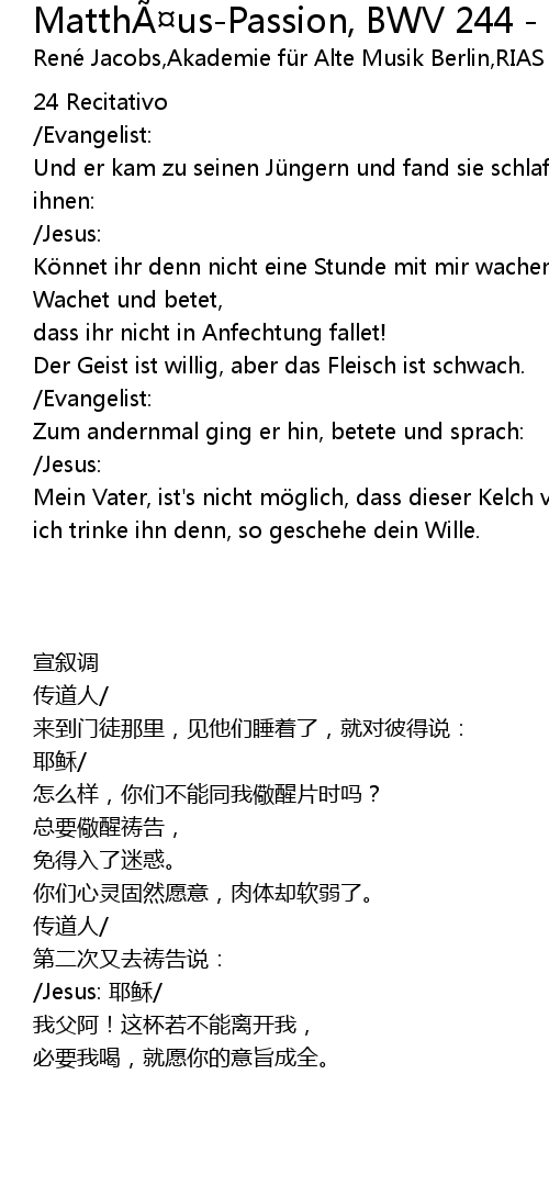 | [00:46.561] | Mein Vater, ist' s nicht m glich, dass dieser Kelch von mir gehe, |