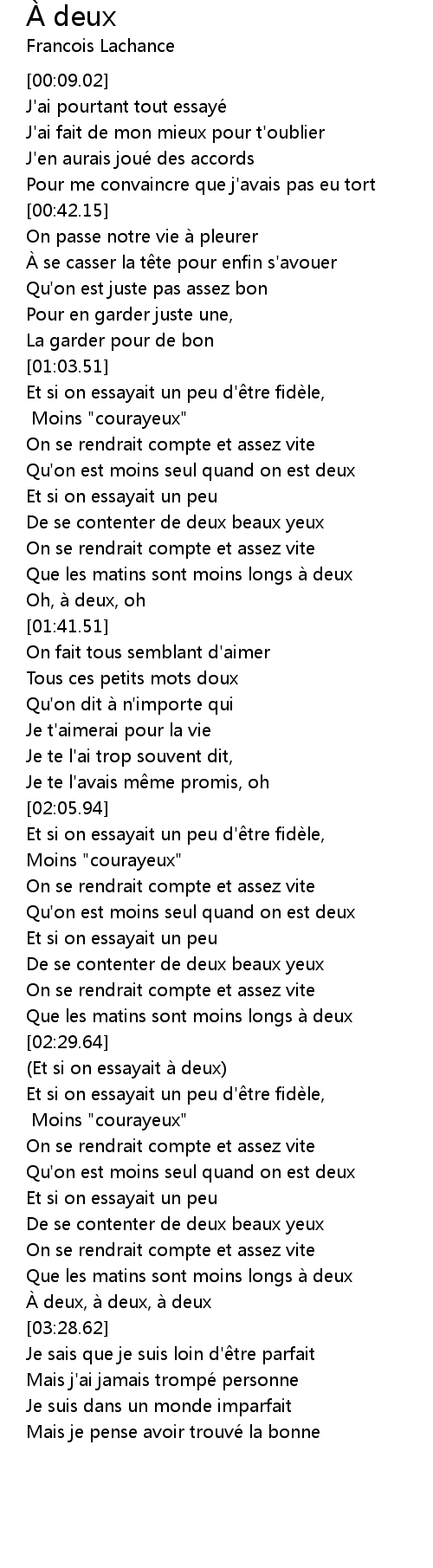 | [02:14.34] | Qu'on est moins seul quand on est deux |