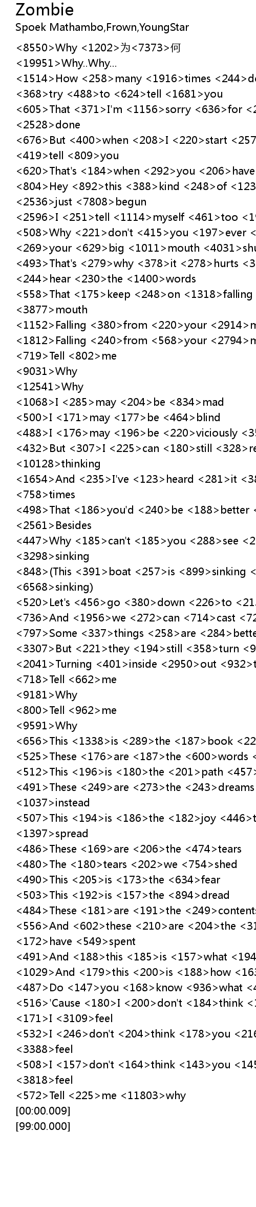| [01:40.18] | 493 That' s 279 why 378 it 278 hurts 312 so 436 bad 320 to 244 hear 230 the 1400 words |