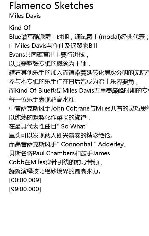| [00:01.37] | Kind Of Blue谱写酷派爵士时期,调试爵士(modal)经典代表; |
