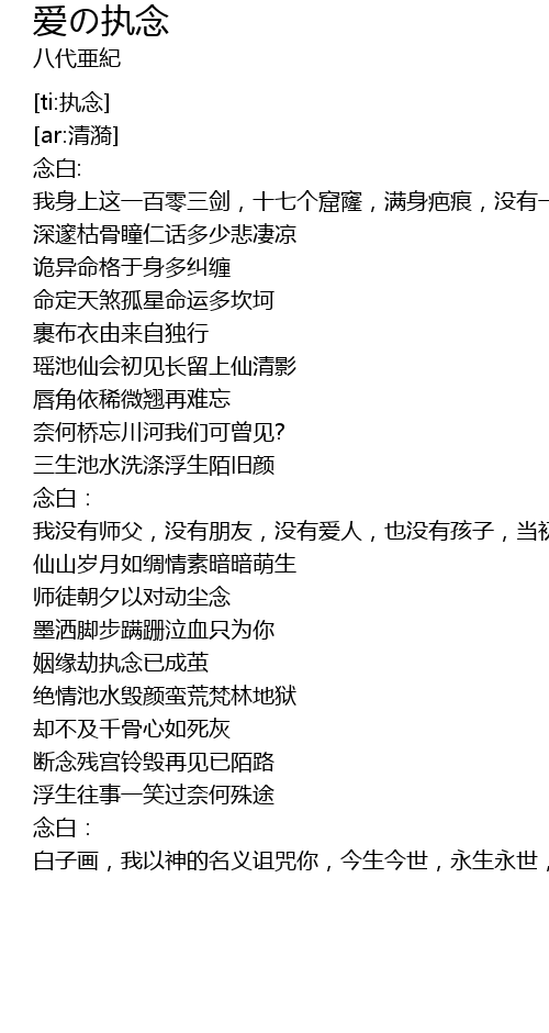| [03:07.194] | 白子画,我以神的名义诅咒你,今生今世,永生永世,不老不死,不伤不灭! |