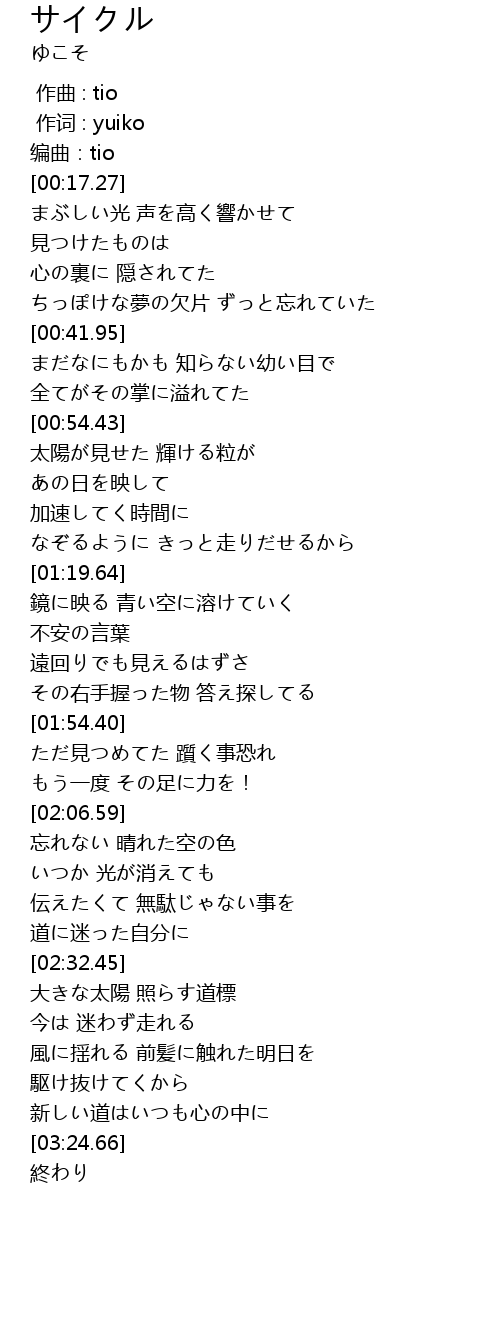 | [00:17.27] | まぶしい光 声を高く響かせて |