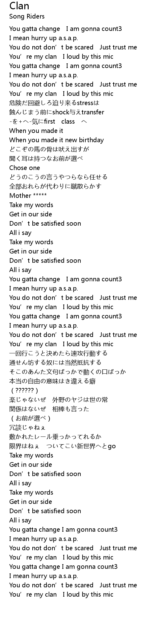 | [03:12.490] | You' re my clan I loud by this mic |