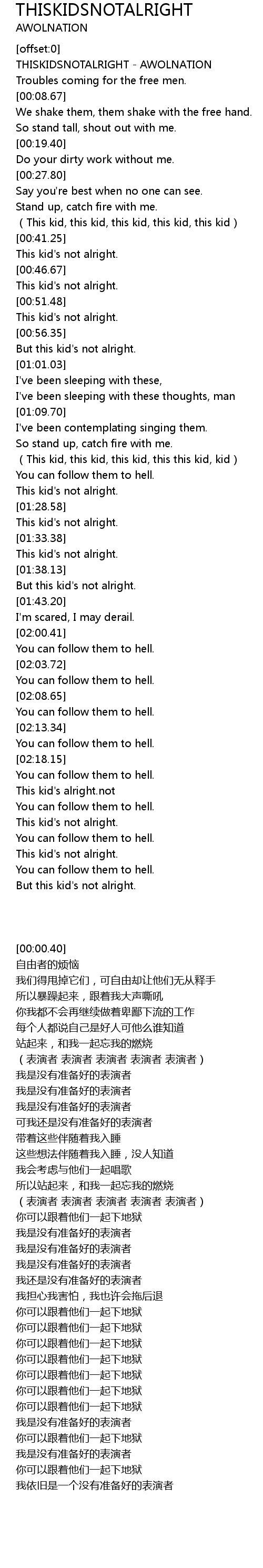 | [00:00.40] | THISKIDSNOTALRIGHT AWOLNATION |