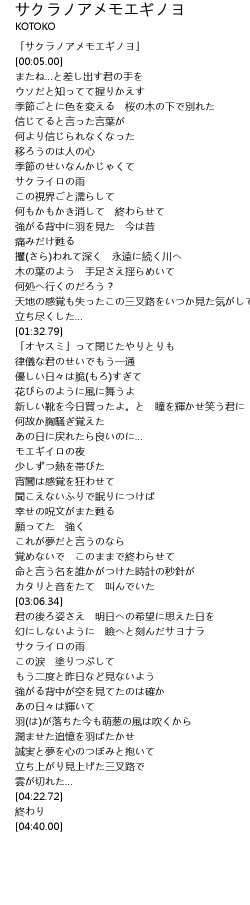 | [00:00.00] | 「サクラノアメモエギノヨ」 |
