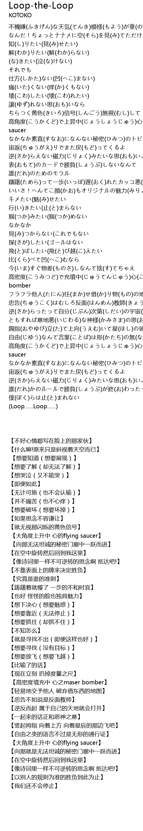 | [00:59.40] | 高角度(こうかくど)で上昇中(じょうしょうじゅう)心(こころ)のflying saucer |