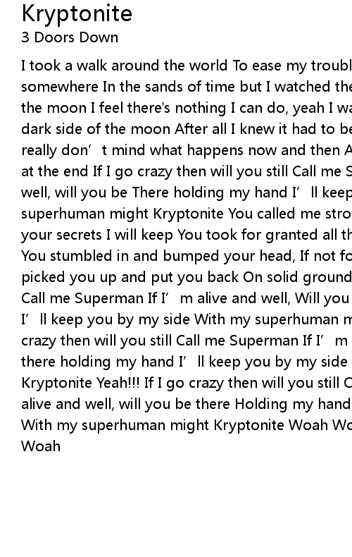 | I took a walk around the world To ease my troubled mind I left my body laying somewhere In the sands of time but I watched the world float To the dark side of the moon I feel there's nothing I can do, yeah I watched the world float To the dark side of the moon After all I knew it had to be Something to do with you I really don’t mind what happens now and then As long as you’ll be my friend at the end If I go crazy then will you still Call me Superman If I’m alive and well, will you be There holding my hand I’ll keep you by my side With my superhuman might Kryptonite You called me strong, you called me weak, But still your secrets I will keep You took for granted all the times I never let you down You stumbled in and bumped your head, If not for me then you'd would be dead I picked you up and put you back On solid ground If I go crazy then will you still Call me Superman If I’m alive and well, Will you be there holding my hand I’ll keep you by my side With my superhuman might Kryptonite (Slower) If I go crazy then will you still Call me Superman If I’m alive and well, Will you be there holding my hand I’ll keep you by my side With my superhuman might Kryptonite Yeah!!! If I go crazy then will you still Call me Superman If I’m alive and well, will you be there Holding my hand I’ll keep you by my side With my superhuman might Kryptonite Woah Woah Woah...Woah Woah Woah...Woah Woah Woah |