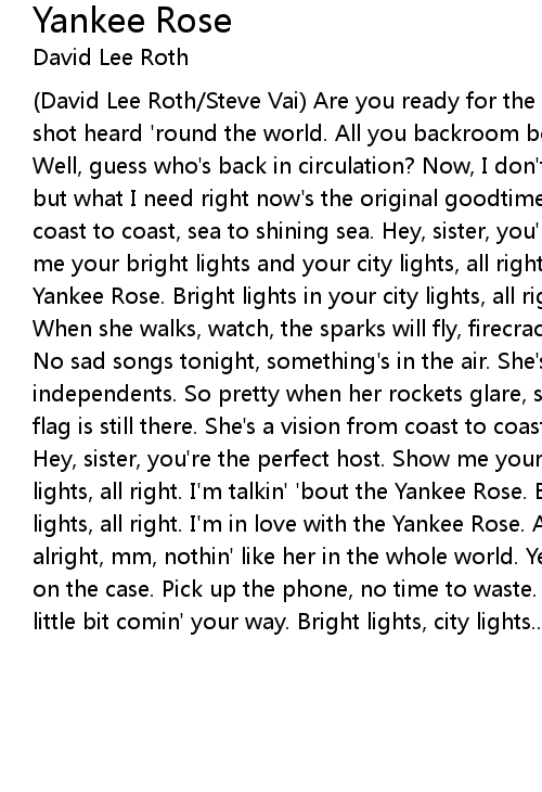(David Lee Roth/Steve Vai) Are you ready for the new sensation? Well, here's the shot heard 'round the world. All you backroom boys salute when her flag unfurls. Well, guess who's back in circulation? Now, I don't know what you may have heard but what I need right now's the original goodtime girl. She's a vision from coast to coast, sea to shining sea. Hey, sister, you're the perfect host. Show me your bright lights and your city lights, all right. I'm talkin' 'bout the Yankee Rose. Bright lights in your city lights, all right. I'm talkin' 'bout it. When she walks, watch, the sparks will fly, firecrackin' on the fourth of July. No sad songs tonight, something's in the air. She's a real state of independents. So pretty when her rockets glare, still provin' any night that her flag is still there. She's a vision from coast to coast, sea to shining sea. Hey, sister, you're the perfect host. Show me your bright lights and your city lights, all right. I'm talkin' 'bout the Yankee Rose. Bright lights in your city lights, all right. I'm in love with the Yankee Rose. Ah, she's beautiful, alright, mm, nothin' like her in the whole world. Yeah, she's right on time, I'm on the case. Pick up the phone, no time to waste. She got the beat and here's a little bit comin' your way. Bright lights, city lights... |