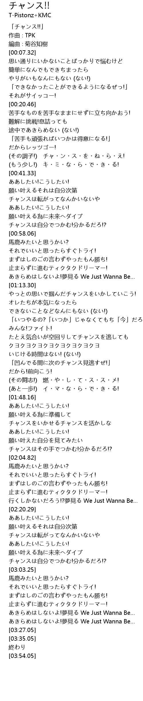 | [01:52.42] | チャンスをいかせるチャンスを活かしな |