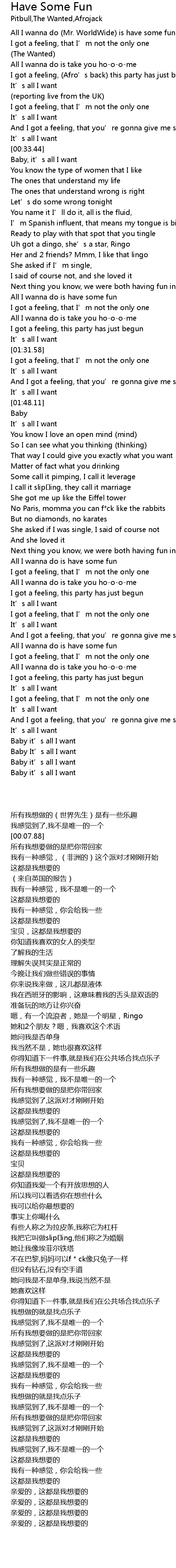 | [00:01.11] | All I wanna do Mr. WorldWide is have some fun |
