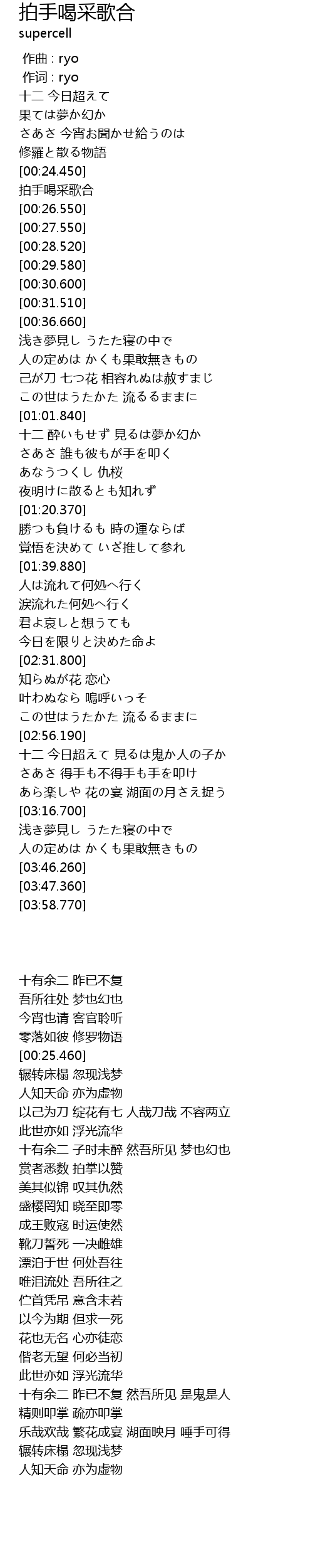 | [01:02.490] | 十二 酔いもせず 見るは夢か幻か |