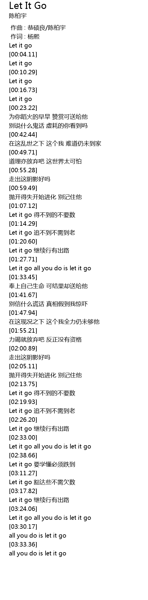 | [03:18.69] | Let it go jì xù xíng yǒu chū lù |