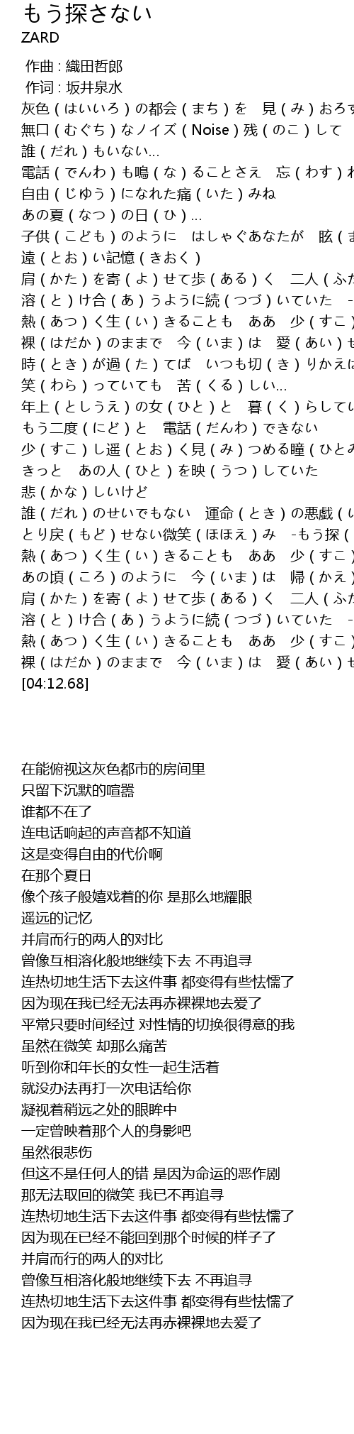 | [01:15.93] | 溶(と)け合(あ)うように続(つづ)いていた -もう探(さが)さない- |