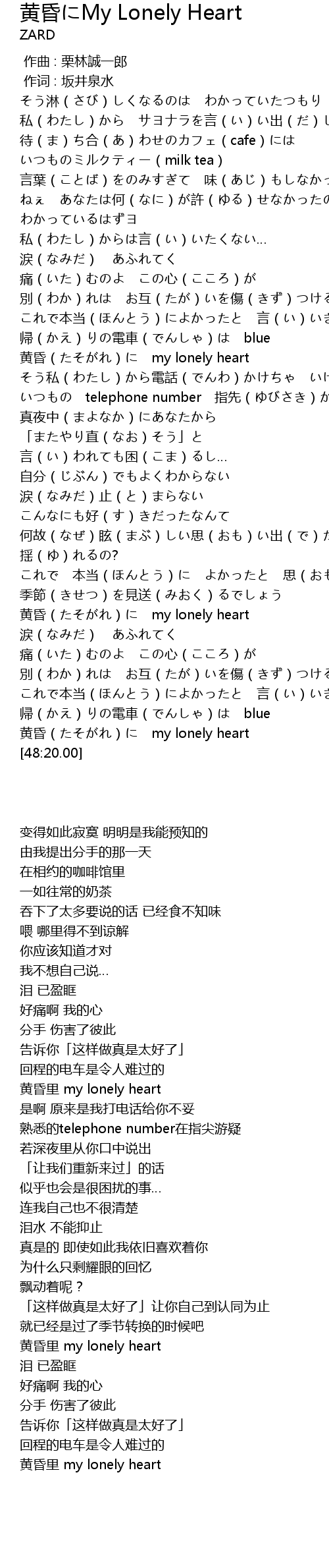 | [01:50.22] | 黄昏(たそがれ)に my lonely heart |