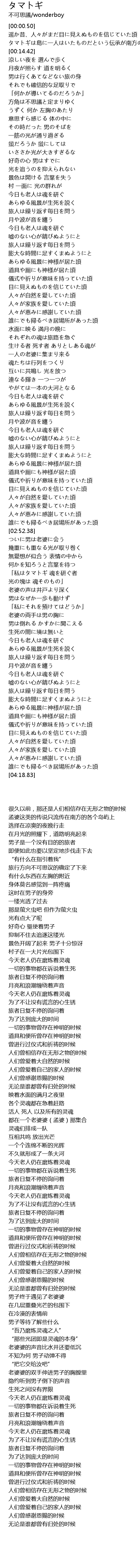 | [00:06.77] | タマトギは島に一人はいたものだという伝承が南方の島々にだけ残っている。 |