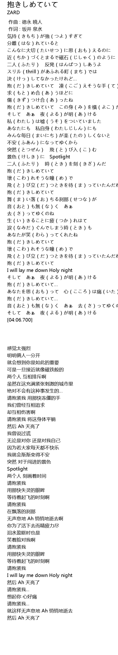 | [01:04.400] | 抱(だ)きしめていて 凍(こご)えそうな手(て)で |