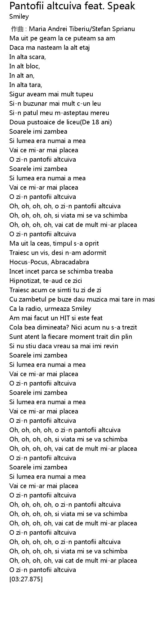 | [02:47.643] | Oh, oh, oh, oh, o zin pantofii altcuiva |