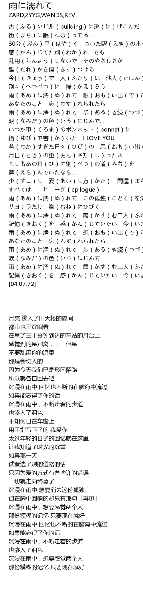 | [01:17.82] | 雨(あめ)に濡(ぬ)れて 想(おも)い出(で)ごと 流(なが)して |