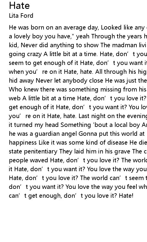 | He was born on an average day, Looked like any other baby Neighbors said " what a lovely boy you have," yeah Through the years he could' ve been Most anybody' s kid, Never did anything to show The madman living in his soul Never know he was going crazy A little bit at a time. Hate, don' t you love it? The world can' t seem to get enough of it Hate, don' t you want it? You love the way you feel when you' re on it Hate, hate. All through his high school days He kept himself hid away Never let anybody close He was just the quiet one Slowly coming undone Who knew there was something missing from his soul? Like a spider building up a web A little bit at a time Hate, don' t you love it? The world can' t seem to get enough of it Hate, don' t you want it? You love the way you feel when you' re on it Hate, hate. Last night on the evening news, I heard his name and it turned my head Something ' bout a local boy And fifteen people dead He thought he was a guardian angel Gonna put this world at peace He was talking ' bout happiness Like it was some kind of disease He died on an average day At the state penitentiary They laid him in his grave The camera' s rolled and the people waved Hate, don' t you love it? The world can' t seem to get enough of it Hate, don' t you want it? You love the way you feel when you' re on it Hate, don' t you love it? The world can' t seem to get enough of it Hate, don' t you want it? You love the way you feel when you' re on it Hate I can' t get enough, don' t you love it? Hate! |