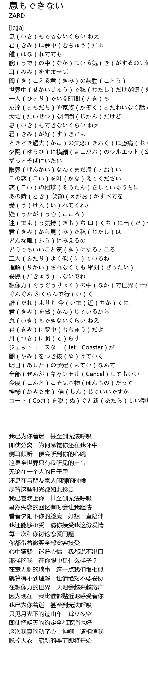 | [01:25.34] | 息(いき)もできないくらい ねえ 君(きみ)が好(す)きだよ |