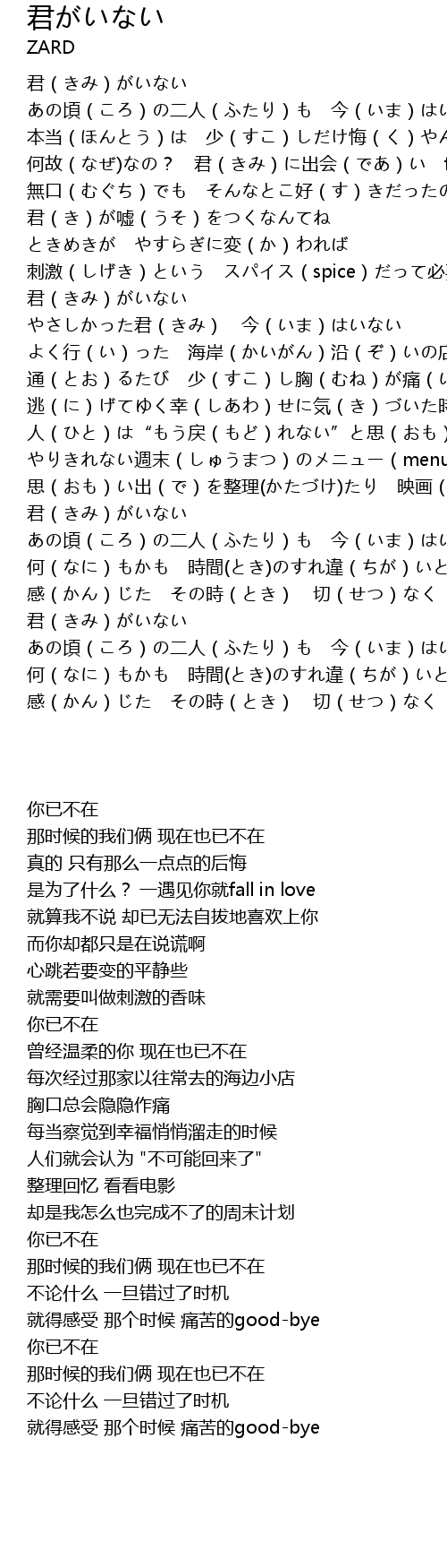 | [02:15.49] | 君(きみ)がいない |