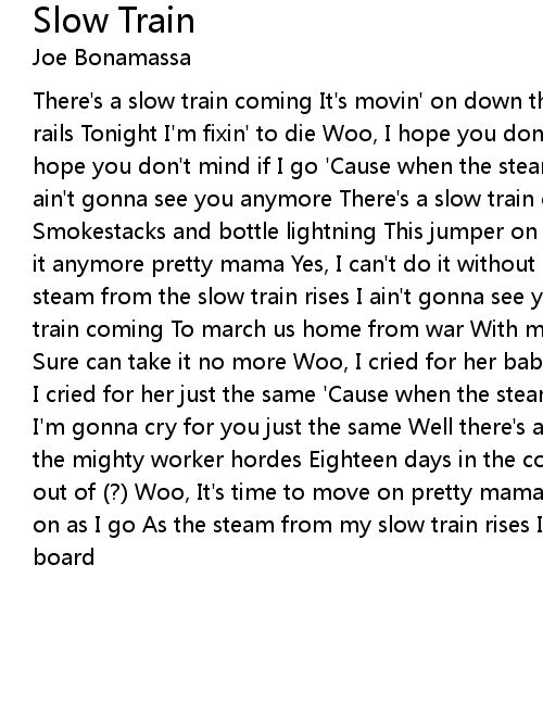 There's a slow train coming It's movin' on down the line Steel wheels on iron rails Tonight I'm fixin' to die Woo, I hope you don't mind pretty mama Woo-hoo, hope you don't mind if I go 'Cause when the steam from the slow train rises I ain't gonna see you anymore There's a slow train coming Coming right on time Smokestacks and bottle lightning This jumper on the line Woo, I can't do without it anymore pretty mama Yes, I can't do it without it anymore 'Cause when the steam from the slow train rises I ain't gonna see you anymore There's a slow train coming To march us home from war With my leather boots and my haversack Sure can take it no more Woo, I cried for her baby when I saw you there Woo-hoo, I cried for her just the same 'Cause when the steam from the slow train rises I'm gonna cry for you just the same Well there's a slow train coming Carrying the mighty worker hordes Eighteen days in the cotton field Enough to put a man out of (?) Woo, It's time to move on pretty mama Woo-hoo, Yes it's time to move on as I go As the steam from my slow train rises It's time for me to get on board
