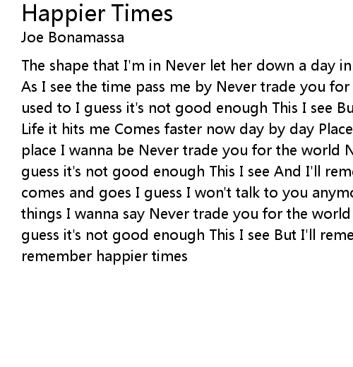 The shape that I'm in Never let her down a day in my life Tree's all around me As I see the time pass me by Never trade you for the world Never do the things I used to I guess it's not good enough This I see But I'll remember happier times Life it hits me Comes faster now day by day Places that I've been Are not the place I wanna be Never trade you for the world Never do the things I used to I guess it's not good enough This I see And I'll remember happier times Friday comes and goes I guess I won't talk to you anymore So many things unsaid So many things I wanna say Never trade you for the world Never do the things I used to I guess it's not good enough This I see But I'll remember happier times And Now remember happier times |