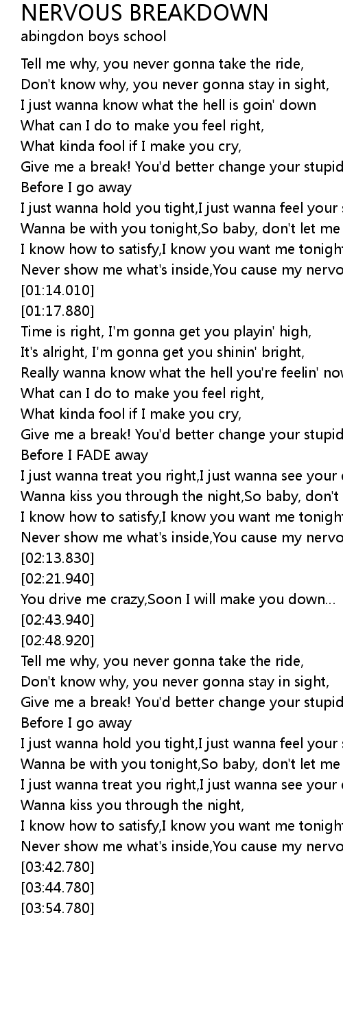 | [01:07.230] | Never show me what' s inside, You cause my nervous breakdown |
