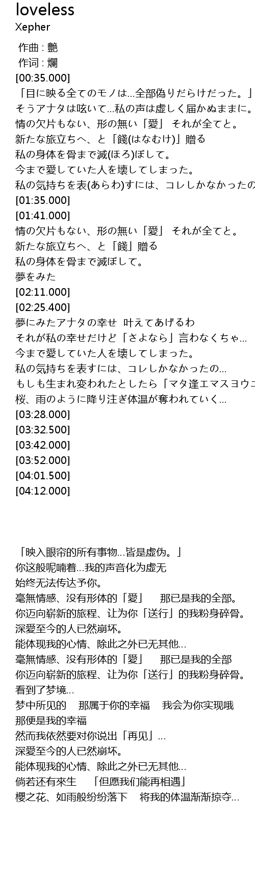 | [00:36.300] | 「目に映る全てのモノは...全部偽りだらけだった。」 |