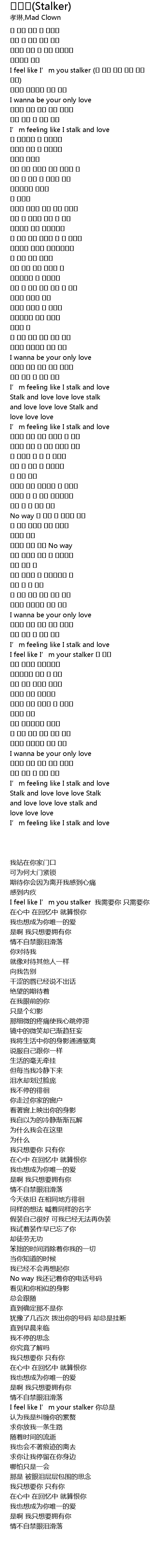 | [00:11.600] | I feel like I’m you stalker (난 너를 원해 너만 원해 니가) |