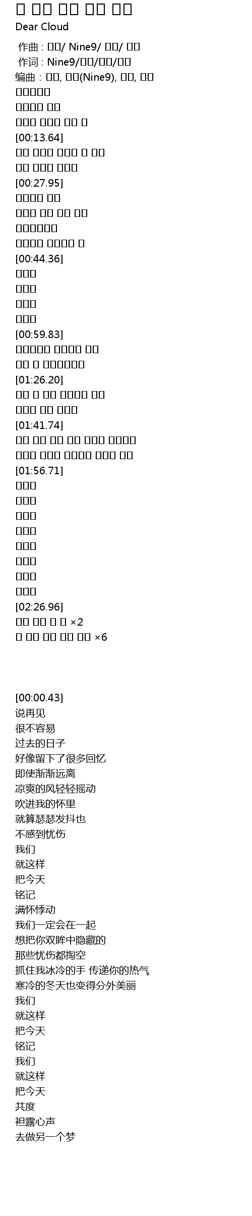 | [00:00.43] | 编曲:용린, 나인(Nine9), 이랑, 광석 |