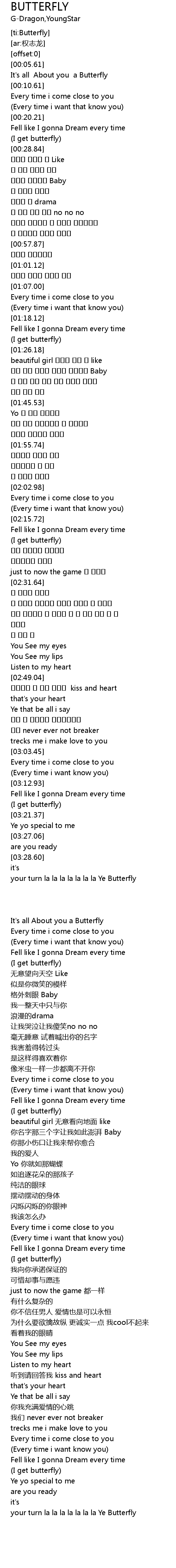 | [03:32.59] | your turn la la la la la la la Ye Butterfly |