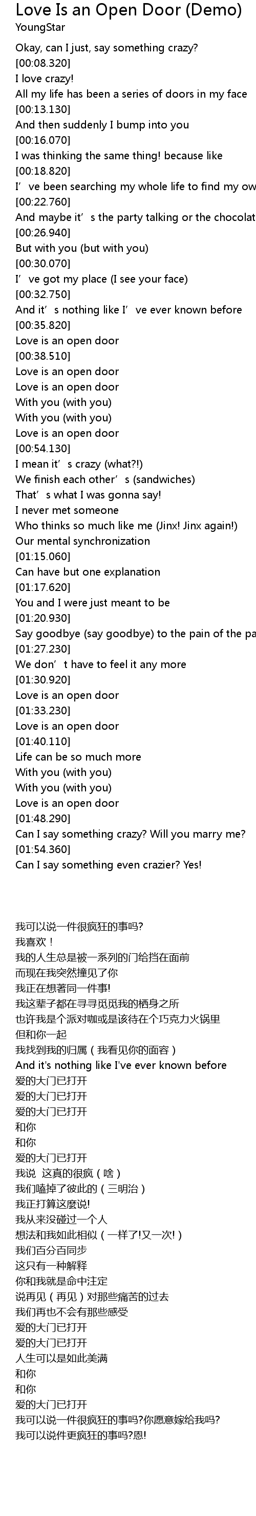 | [01:52.040] | Can I say something crazy? Will you marry me? |