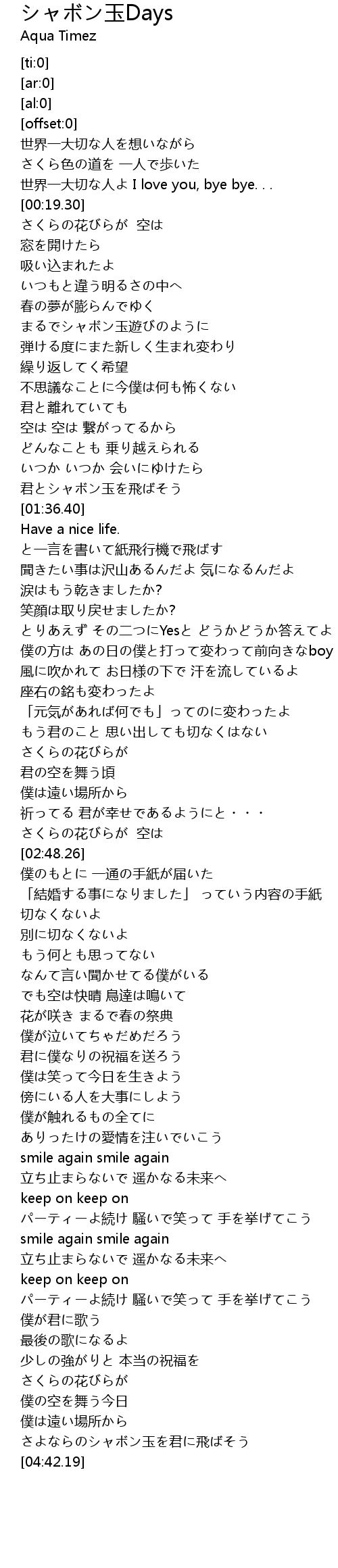 | [04:34.72] | さよならのシャボン玉を君に飛ばそう |