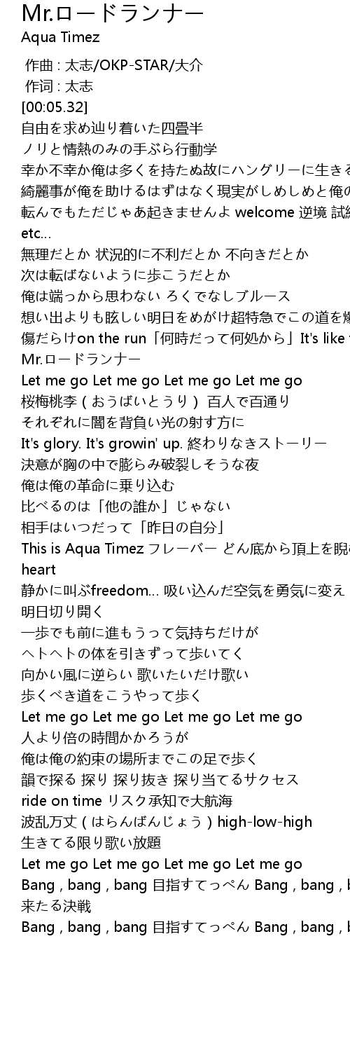 | [01:06.85] | 傷だらけon the run「何時だって何処から」It's like that, Mr.ロードランナー |
