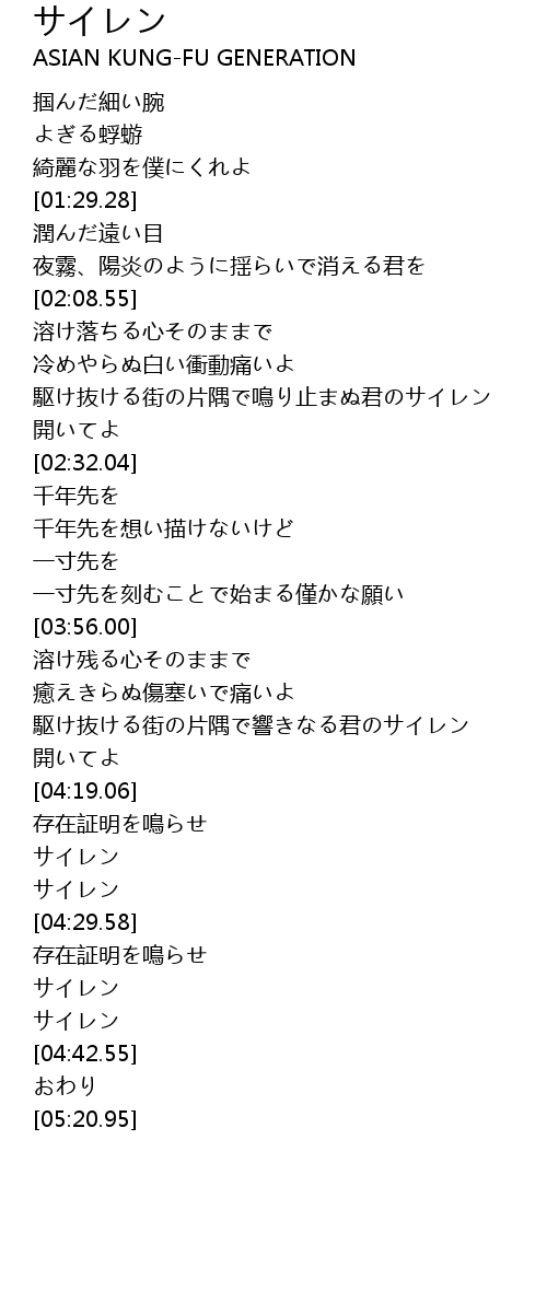| [02:19.59] | 駆け抜ける街の片隅で鳴り止まぬ君のサイレン |