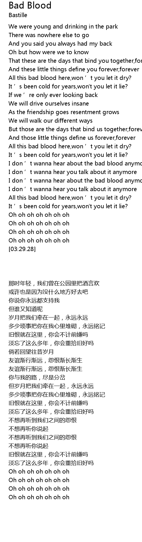 | [02:33.35] | I don ' t wanna hear about the bad blood anymore |